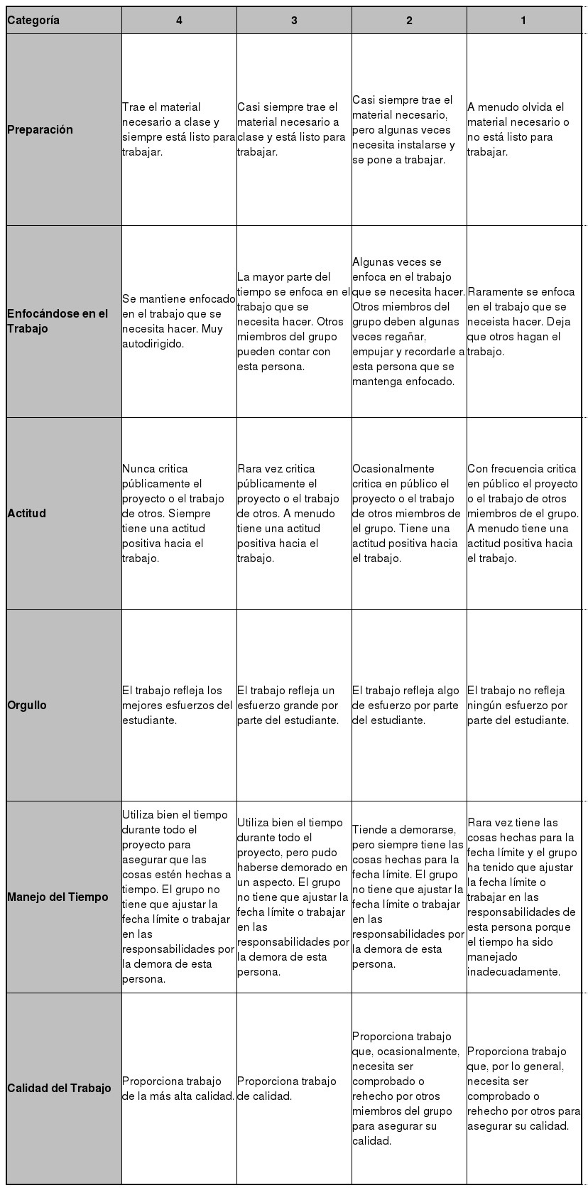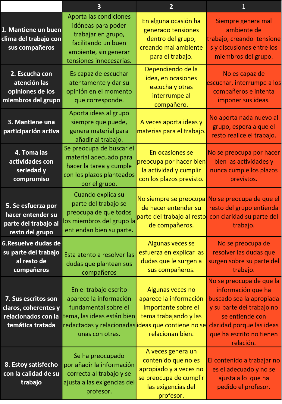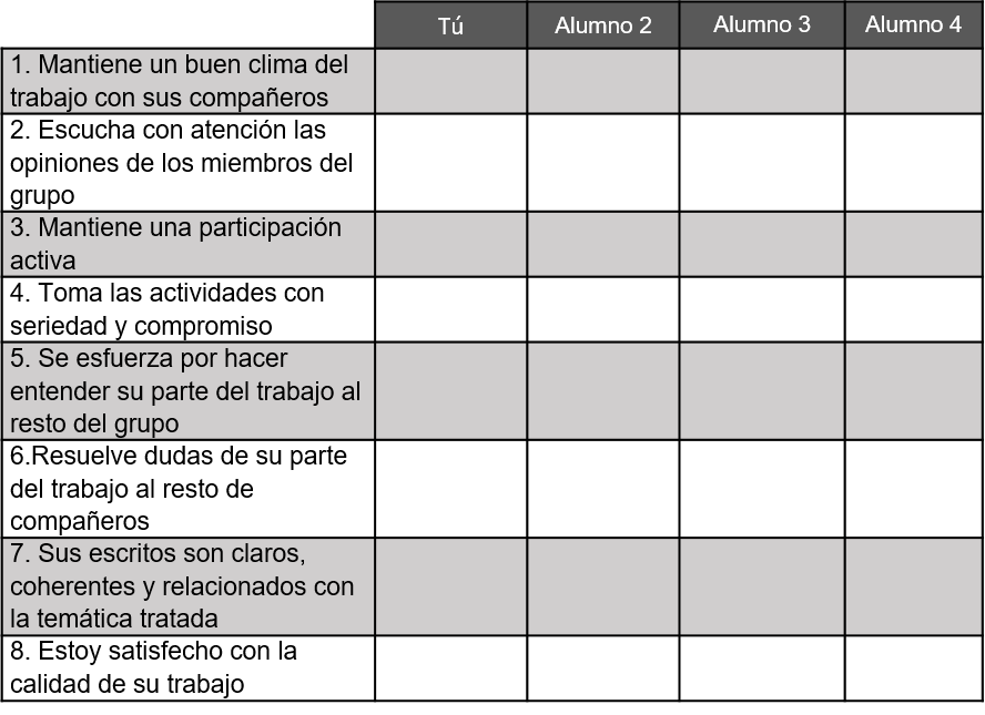 Para rellenar esta primera tabla debes asignar a cada alumno el nombre de un integrante de tu grupo y evaluarle.