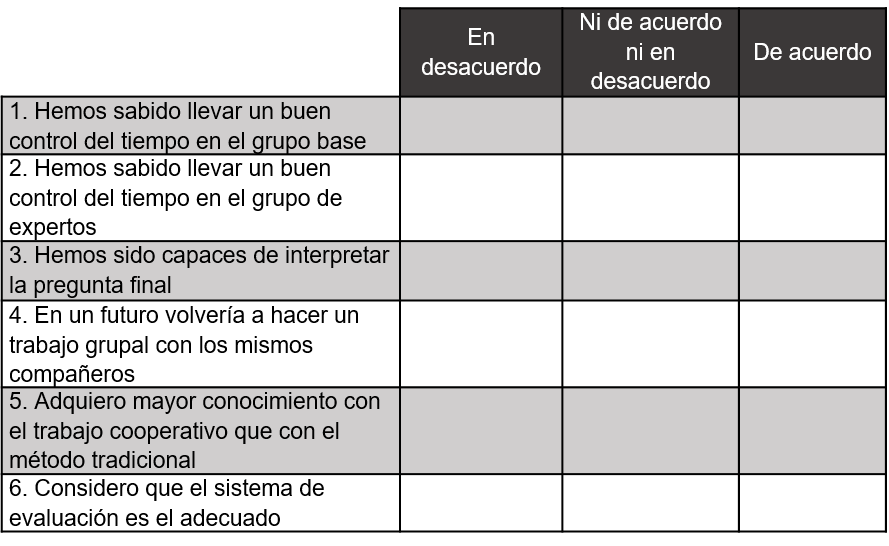 En este apartado debéis dar vuestra opinión acerca del funcionamiento del grupo y del método. Colocar una (X) donde consideres oportuno.