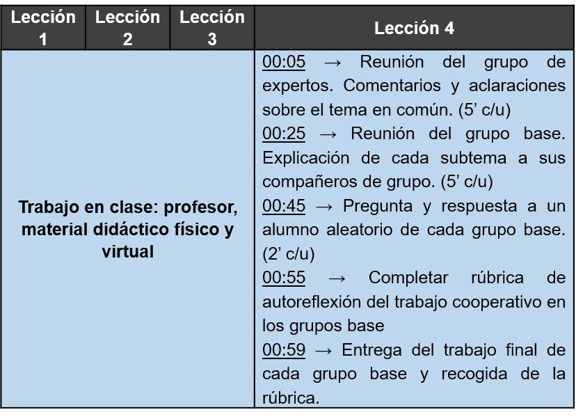 Tras la reunión de expertos volveréis al grupo base donde explicaréis vuestro tema al resto de compañeros con el que habéis hecho el trabajo final. Esta fase ocupará 20 minutos, donde cada alumno tendrá 5 minutos para exponerlo.